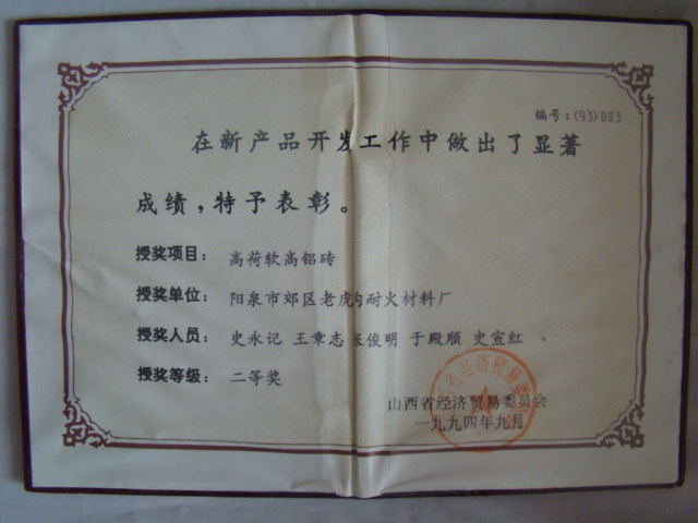 熱風(fēng)爐用低蠕變高鋁磚、高荷軟高鋁磚獲省科技進(jìn)步二等獎,微膨脹高鋁磚列入火炬計劃項(xiàng)目,炭素焙燒爐用特種高鋁磚已批準(zhǔn)國家專利